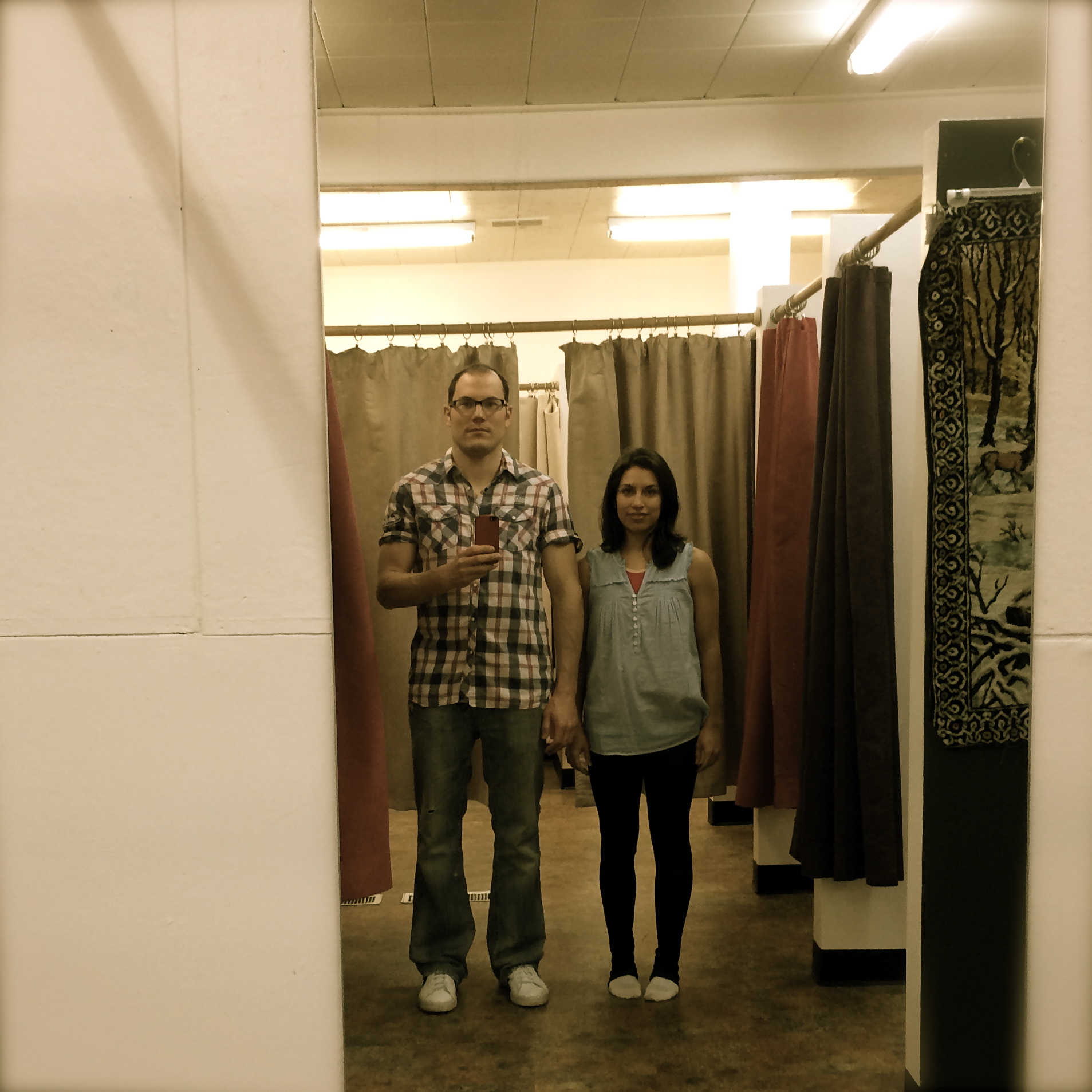 (The picture above is my sweetheart, Amois, at Buffalo Exchange in Portland doing a selfie version of Grant Wood’s American Gothic, included below for your enjoyment. How did we do on the 21st century version?)